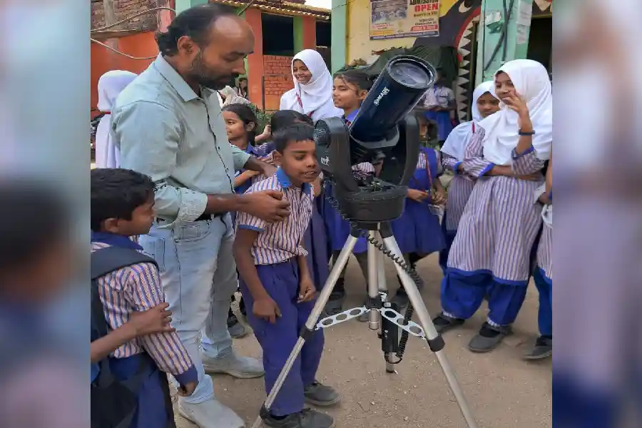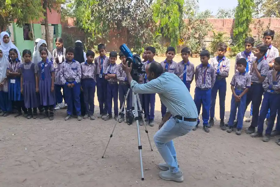 ছাজিদ হুছেইনে শিশুক টেলিস্কোপৰ ব্যৱহাৰ দেখুৱাই থকা এক দৃশ্য