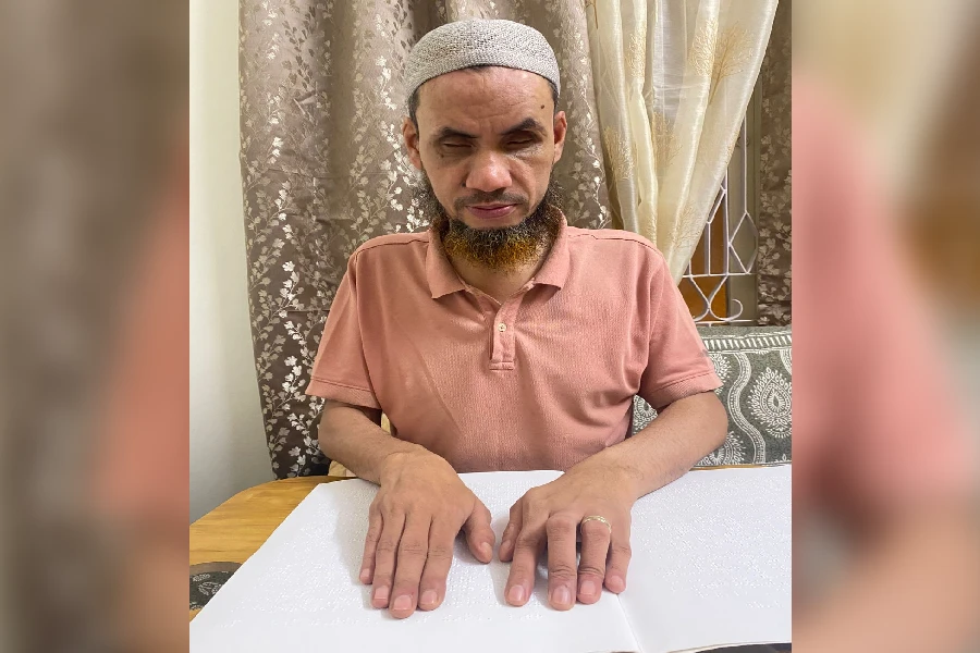 এগৰাকী দৃষ্টিহীন ব্যক্তিয়ে ব্ৰেইল শিকি থকা এক দৃশ্য