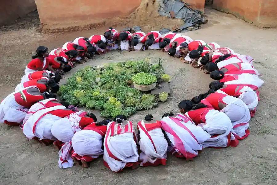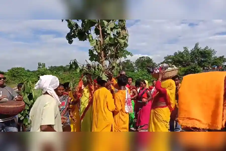 যুৱতীসকলে কৰম গছক সেৱা জনোৱাৰ এক দৃশ্য