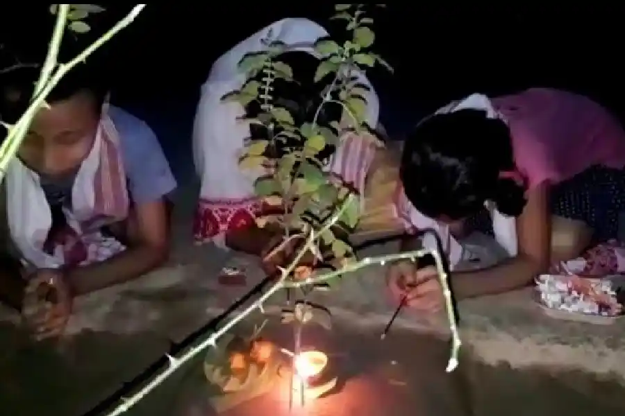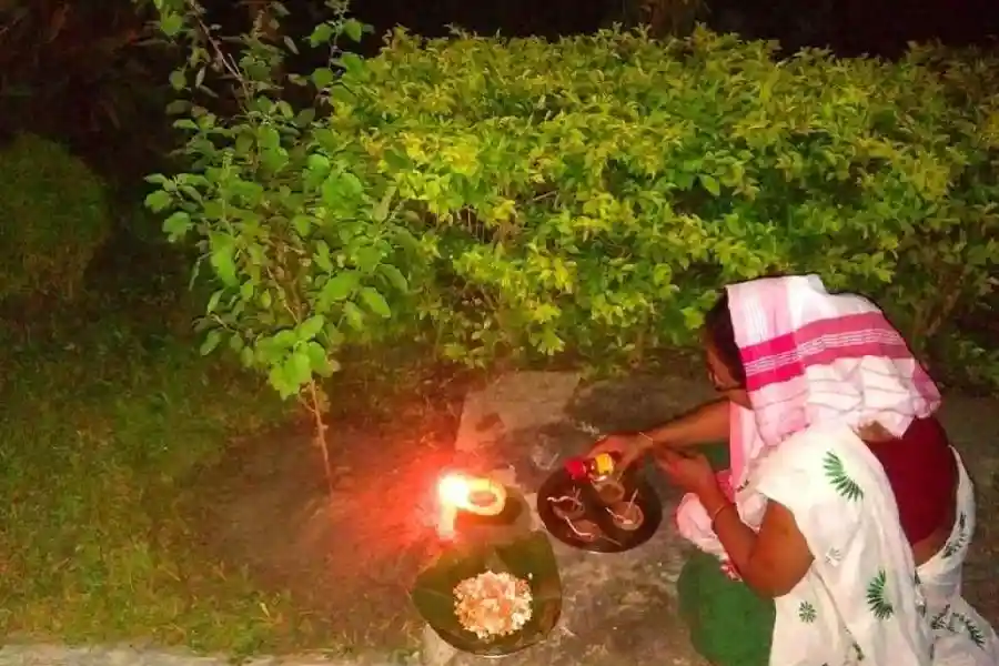 কাতি বিহুৰ দিনা তুলসীৰ তলত চাকি জ্বলাই ভগৱানৰ ওচৰত প্ৰাৰ্থনা কৰাৰ এক দৃশ্য