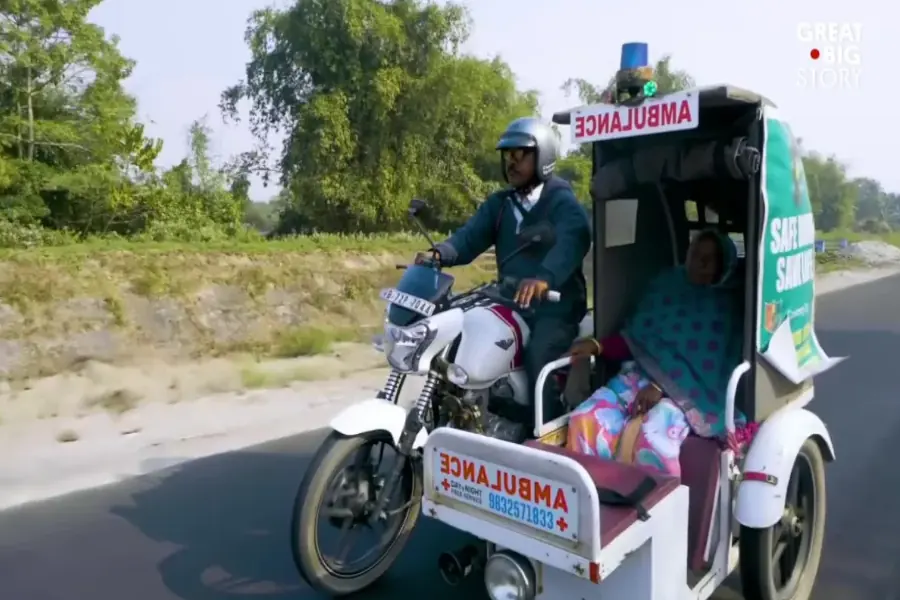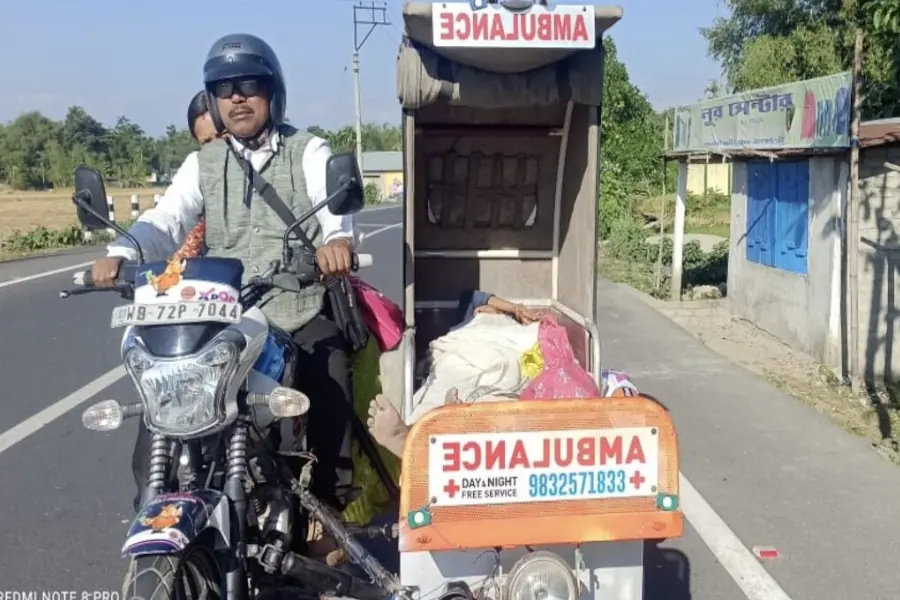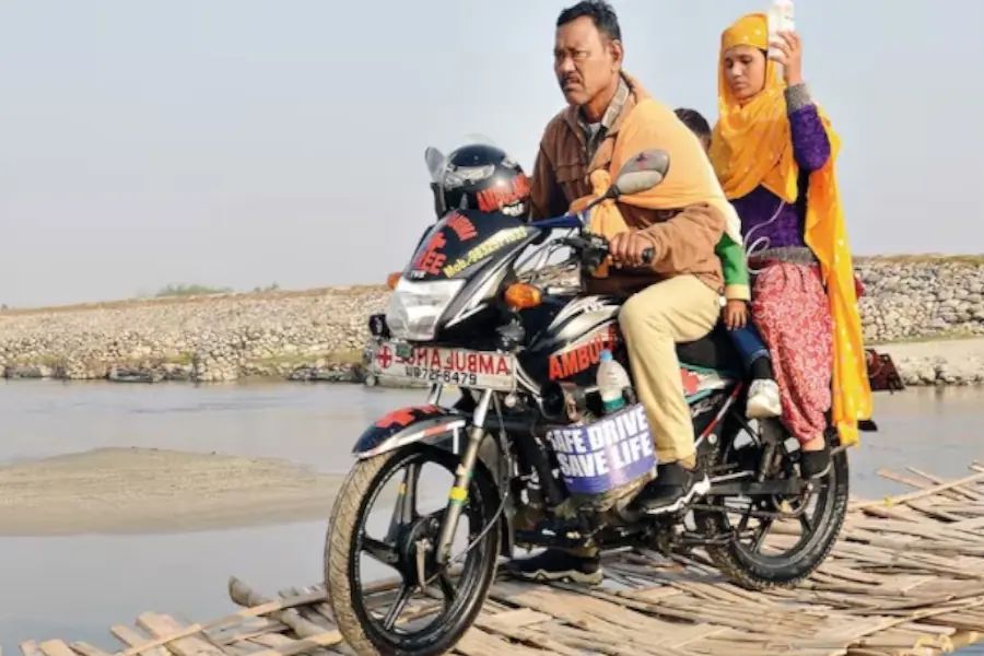 'এম্বুলেন্স দাদা'ই বাইক এম্বুলেন্সত এজন ৰোগীক চিকিৎসালয়লৈ লৈ যোৱাৰ দৃশ্য