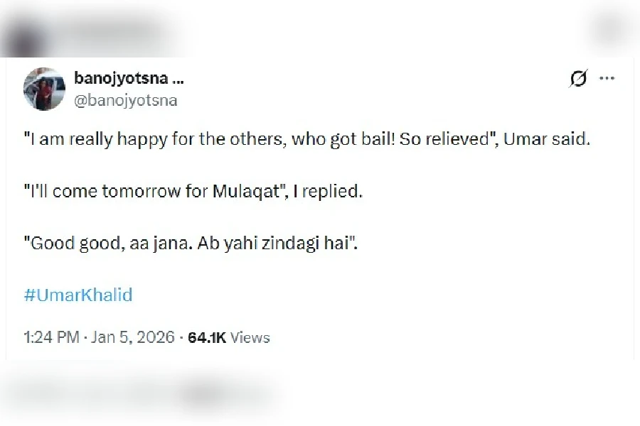 সোমবাৰে উচ্চতম ন্যায়ালয়ে উমাৰ খালিদৰ জামিন নাকচ কৰাৰ পিছত, তেওঁৰ সংগিনী বানোজ্যোৎস্না লাহিড়ীয়ে তেওঁৰ সৈতে হোৱা এক সংক্ষিপ্ত ব্যক্তিগত বাৰ্তালাপ সামাজিক মাধ্যমত প্লেটফৰ্ম এক্সত শ্বেয়াৰ কৰিছে।