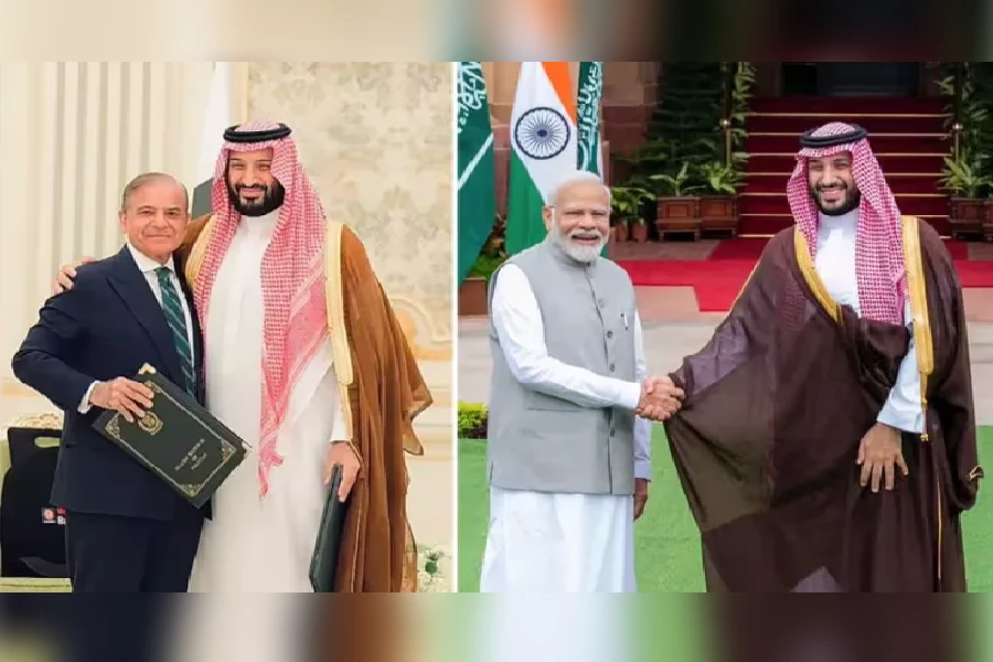 ছৌদি আৰবৰ ক্ৰাউন প্ৰিন্স মহম্মদ বিন ছলমান আল ছাউদ পাকিস্তানৰ প্ৰধানমন্ত্ৰী শ্বেহবাজ শ্বৰীফৰ সৈতে (বাওঁফালে) আৰু ছৌদি আৰবৰ ক্ৰাউন প্ৰিন্স মহম্মদ বিন ছলমান আল ছাউদ প্ৰধানমন্ত্ৰী নৰেন্দ্ৰ মোদীৰ সৈতে (সোঁফালে)