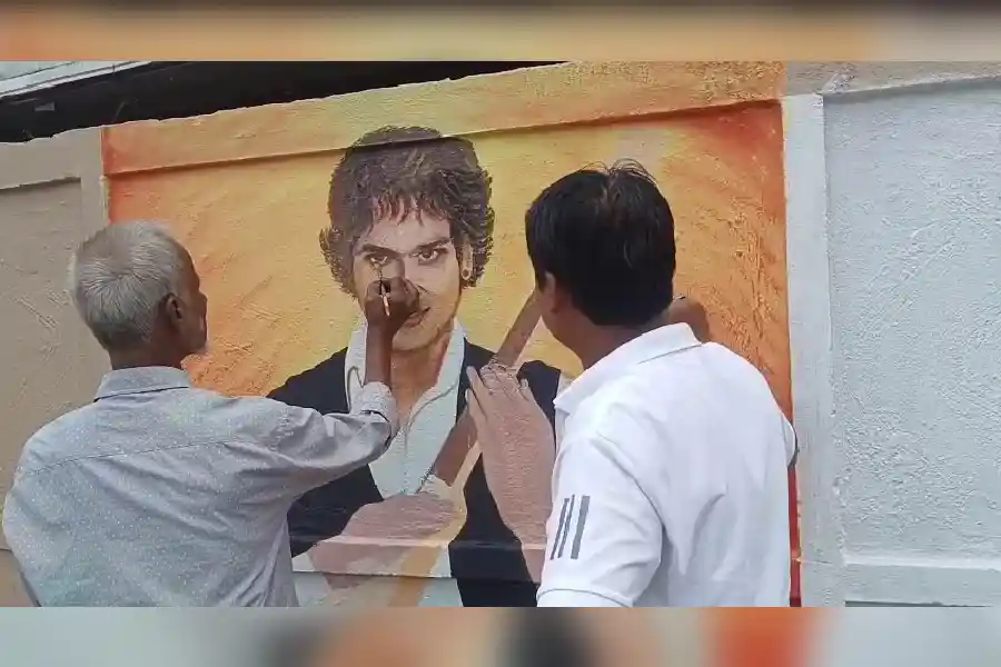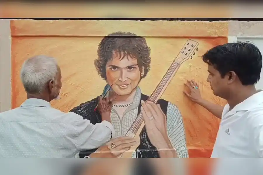 দেৱালত জুবিন গাৰ্গৰ ছবি অংকন কৰি থকাৰ এক দৃশ্য