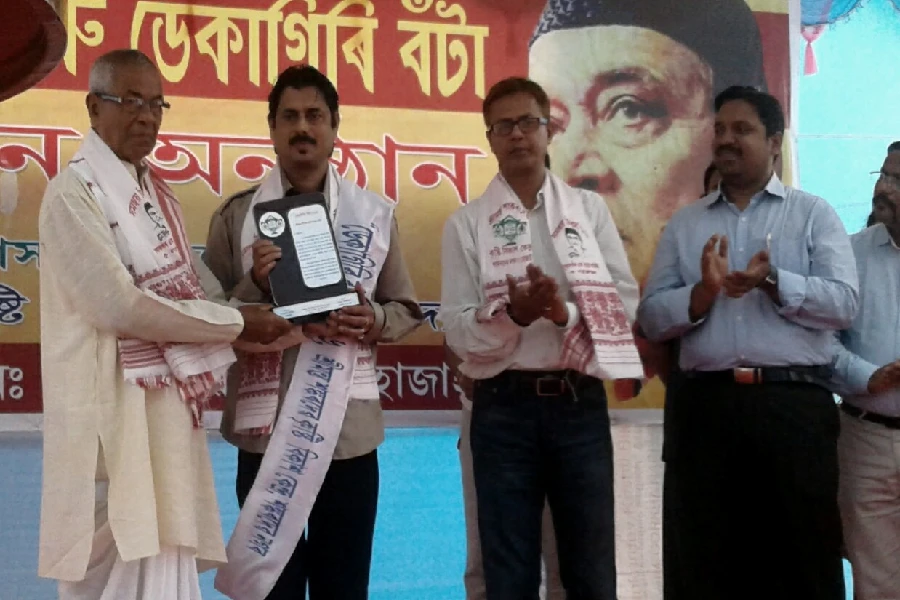 বাঁহীবাদক দীপক শৰ্মাই এক অনুষ্ঠানত বঁটা গ্ৰহণ কৰাৰ এক দৃশ্য