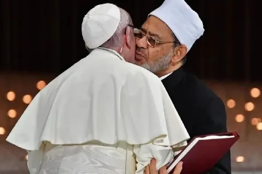 প্ৰয়াত পোপ ফ্ৰান্সিছ আৰু ইজিপ্তৰ আল-আজহাৰ মছজিদৰ গ্ৰেণ্ড ইমাম শ্বেইক আহমদ এল-তায়েবে আলিংগন কৰাৰ এক দৃশ্য