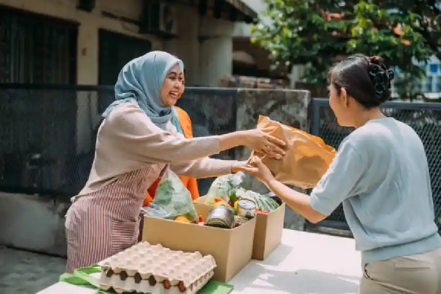 এগৰাকী মহিলাই খাদ্য বিতৰণ কৰাৰ এক দৃশ্য
