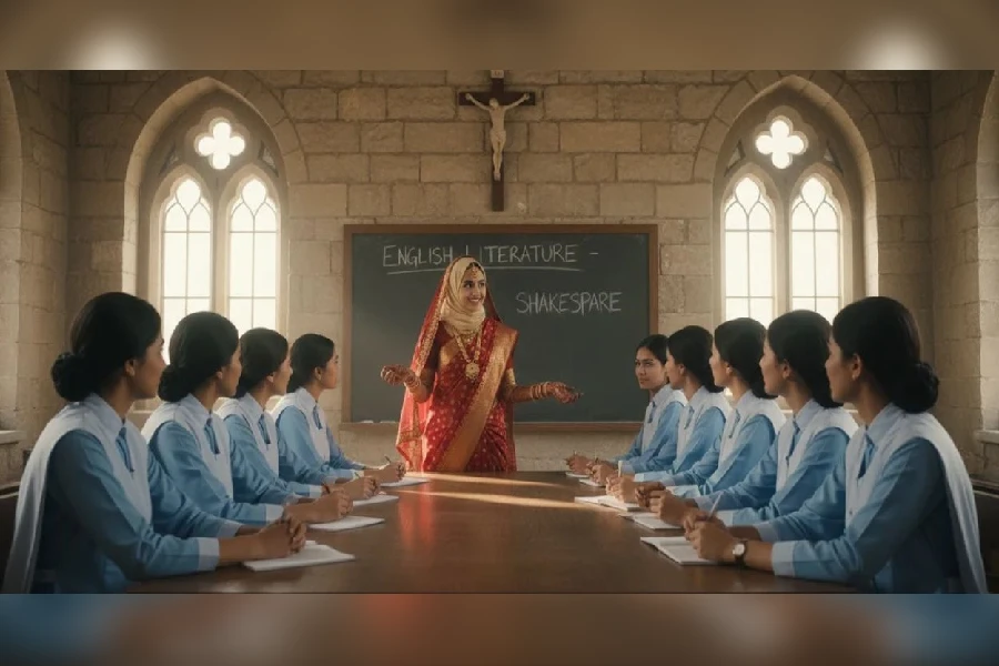 কেথলিক স্কুল এখনত এগৰাকী মুছলমান মহিলাই হিন্দু কইনাৰ দৰে সাজ-পোছাক পিন্ধিছিল, আৰু কোনেও তেওঁক প্ৰশ্ন কৰা নাছিল। স্কুলখন চলোৱা লৰেটো চিষ্টাৰসকলেও আপত্তি কৰা নাছিল। শিক্ষকসকলে বিচাৰ কৰা নাছিল। ছাত্ৰ-ছাত্ৰীসকলে স্বাভাৱিকতে মানি লৈছিল। মনত আছে, কৰিড’ৰত চিষ্টাৰ এন্নে তেওঁক চাই হাঁহি হাঁহি কৈছিল, "আপোনাক দেখাত মৰম লগা হৈছে।”