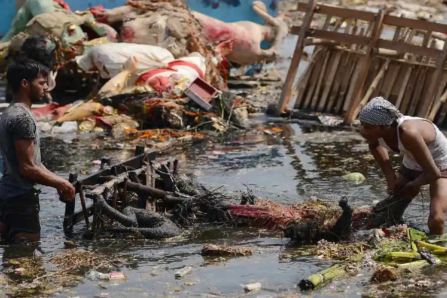 কলকাতা, হাওৰা, চেৰামপুৰ, চন্দননগৰৰ ঘাটত প্ৰতি বছৰে লাখ লাখ প্ৰতিমা বিসৰ্জন দিয়া হয়। প্ৰতিমাৰ ফুল, প্লাষ্টাৰ, ৰং, পলিথিন ওপঙি তললৈ নামি যায় আৰু এই সকলোবোৰ গংগাত জমা হৈ ভয়ংকৰ আৱৰ্জনাৰ তৰপৰ সৃষ্টি কৰে।