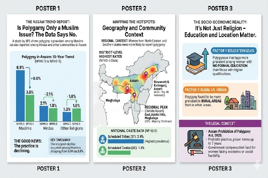ৰাষ্ট্ৰীয় পৰিয়াল স্বাস্থ্য জৰীপ (NFHS)ৰ তৃতীয় (২০০৫-০৬), চতুৰ্থ (২০১৫-১৬) আৰু পঞ্চম (২০১৯-২১) পৰ্যায়ৰ তথ্য বিশ্লেষণ কৰি IIPS-ৰ অধ্যয়নত পোৱা গৈছে যে ১৫ বছৰত অসমত বহুবিবাহৰ হাৰ ৩.৩ শতাংশৰ পৰা ২.৪ শতাংশলৈ হ্ৰাস পাইছে।